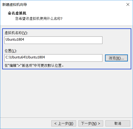 6、此处根据自己的情况,给虚拟机命名和指定安装位置(博主的C盘容量充足,所以就直接放在C盘了),然后“下一步”;