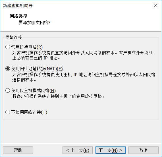8、为虚拟机选择网络类型,默认“使用网络地址转换(NAT)”即可,然后“下一步”;