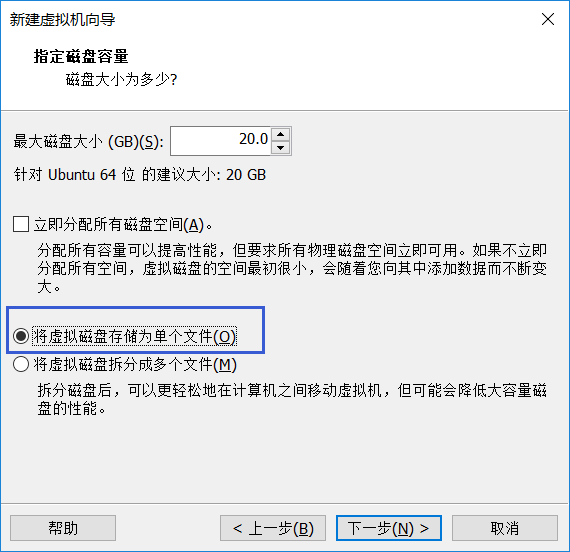 10、默认最大磁盘大小20GB,然后选择“将虚拟磁盘存储为单个文件”,然后“下一步”;