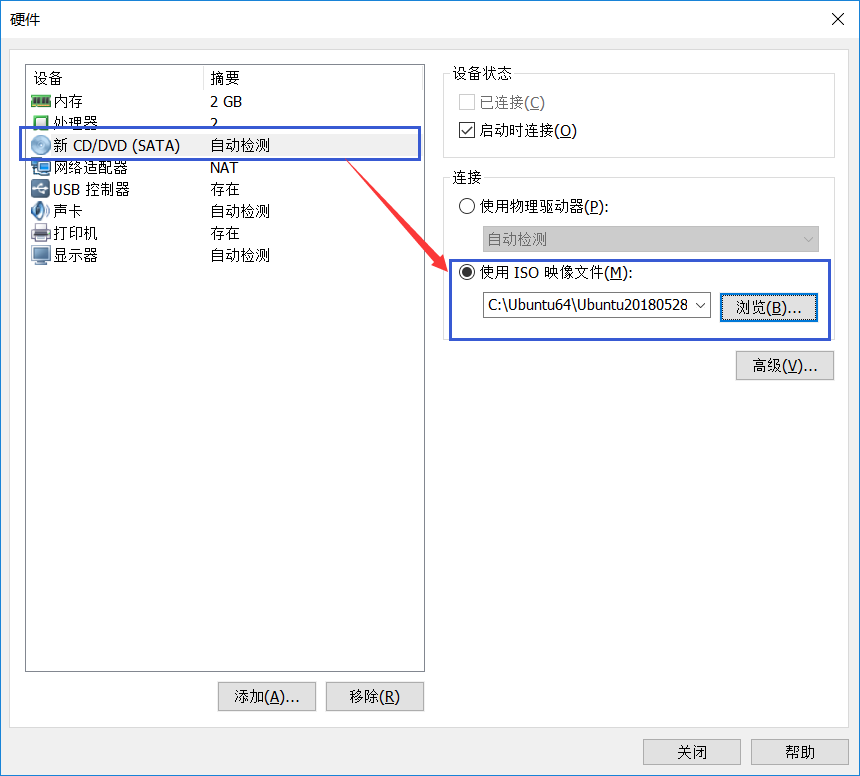 12、弹出硬件设置框,选择“新CD/DVD(SATA)”这一项,然后在右边选择“使用ISO映像文件”,然后选择我们前面下载的Ubuntu 18.04 LTS镜像文件的路径,完成后点击“关闭”,回到上个页面点击“完成”,这样向导设置就完成了;