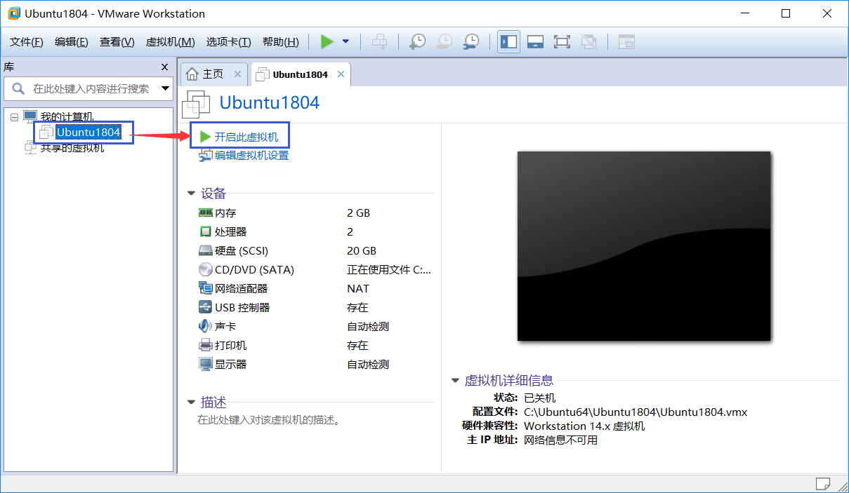 13、虚拟机已经配置完毕,接下来我们开启刚才创建的虚拟机,选择相应的虚拟机名称,然后点击“开启此虚拟机”(此处可能遇到各种问题,根据报错信息搜索相关解决办法即可);
