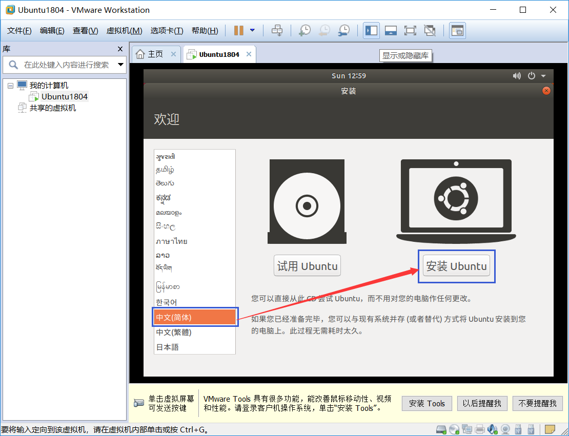 14、正常情况下会来到如下页面,选择“中文(简体)”,然后点击“安装Ubuntu”即可(注意:要将输入定向到虚拟机,在虚拟机内部单击或按Ctrl+G;要返回到你的计算机,将鼠标指针从虚拟机中移出或按Ctrl+Alt。另外,界面底部提醒我们安装VMware Tools,此时可不必理会或“以后提醒我”,以免扰乱我们正常的安装进程 );