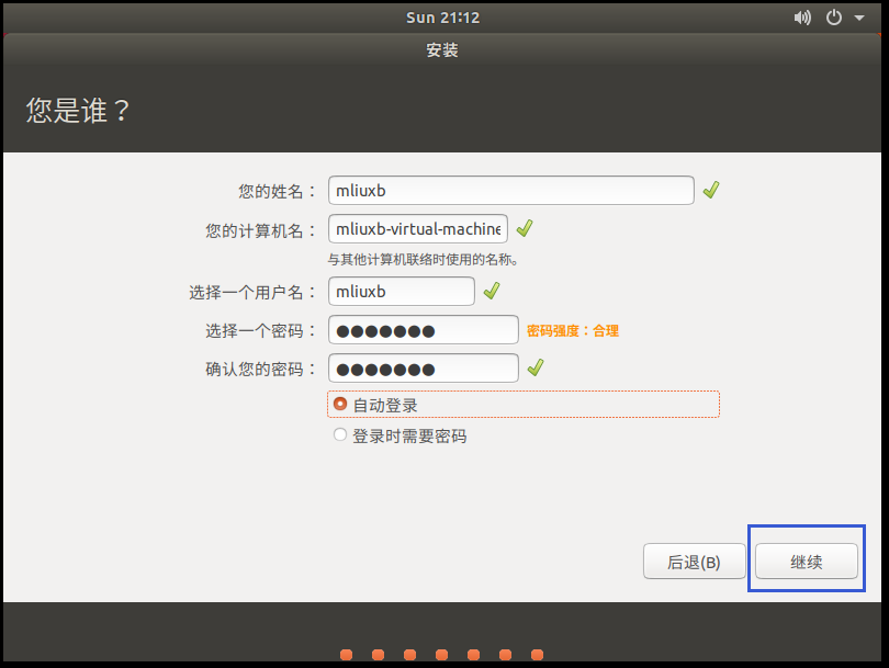 20、设置你自己的用户名和密码(下面如果选择登录时需要密码,则每次登录需要输入密码,为了方便博主选择了自动登录),然后“继续”;