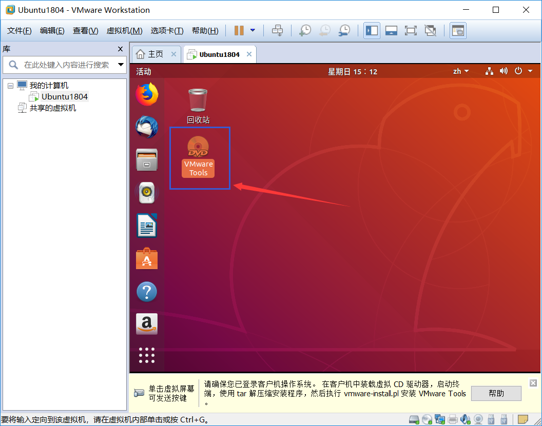 2、完成后,我们进入Ubuntu,在桌面上会出现VMware Tools的光盘,点击进入其中;