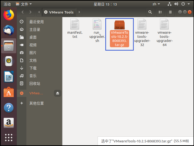 3、进入后会看到一个压缩文件 VMwareTools-10.2.5-8068393.tar.gz(中间的数字不同的虚拟机版本可能会不一样),然后我们复制这个文件;