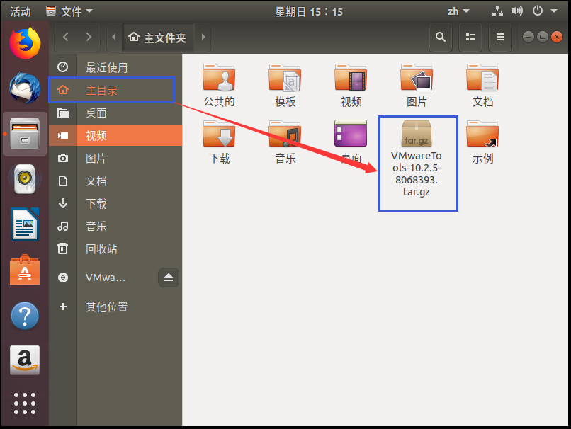 4、将复制的 VMwareTools-10.2.5-8068393.tar.gz 压缩文件粘贴到我的主目录下面(即home->个人用户名的目录下面);