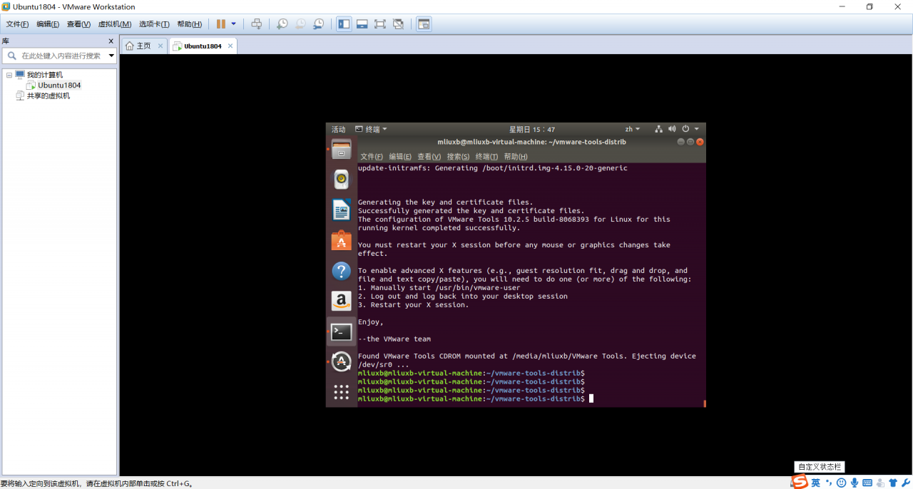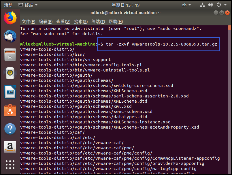 5、按【Ctrl+Alt+T】调出终端命令界面,输入命令【tar -zxvf VMwareTools-10.2.5-8068393.tar.gz】然后回车执行,解压这个压缩文件(可以在输入【tar -zxvf VM】后按【Tab】键自动补全整个文件的名字);