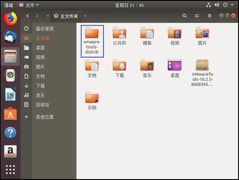 6、解压完成后,在原来的主目录下会多出一个 vmware-tools-distrib 的文件夹;