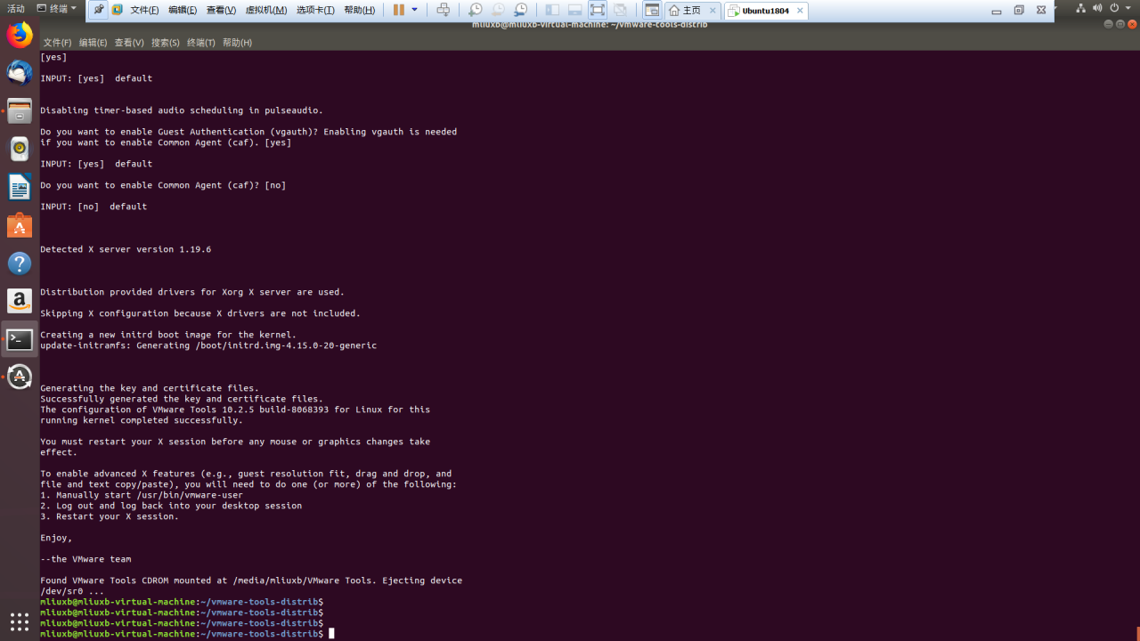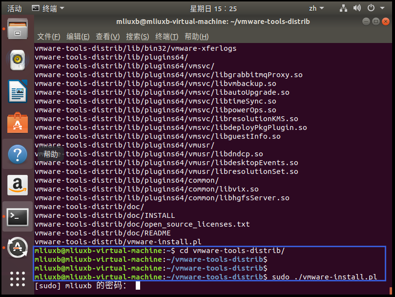 7、接着输入命令【cd vmware-tools-distrib】后回车进入这个文件夹(可以在输入【cd vm】后按【Tab】键自动补全整个文件夹的名字),然后输入命令【sudo ./vmware-install.pl】回车后输入用户密码,然后经过安装向导选择后即可安装成功;