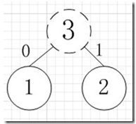 简易的理解就是,假如我有A,B,C,D,E五个字符,出现的频率(即权值)分别为5,4,3,2,1,那么我们第一步先取两个最小权值作为左右子树构造一个新树,即取1,2构成新树,其结点为1+2=3,如图: