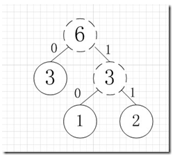 虚线为新生成的结点,第二步再把新生成的权值为3的结点放到剩下的集合中,所以集合变成{5,4,3,3},再根据第二步,取最小的两个权值构成新树,如图: