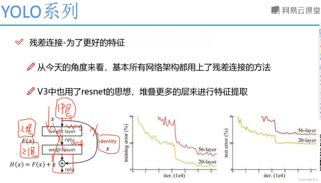 残差思想:解决卷积多层反而效果变得更差的问题,比如训练到第19层取当前效果为x,再下面的训练为F(X),如果F(X)训练后发现效果更差则F(X)=0,得到的结果为H(X)=F(X)+X,这样至少不会让效果更差。
