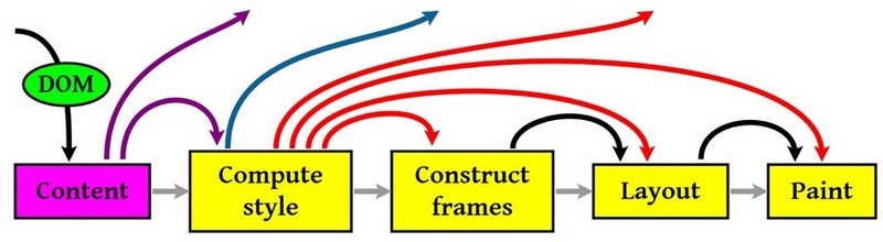 然后,图中的线与箭头代表通过js动态修改了DOM或CSS,导致了重新布局(Layout)或渲染(Repaint)