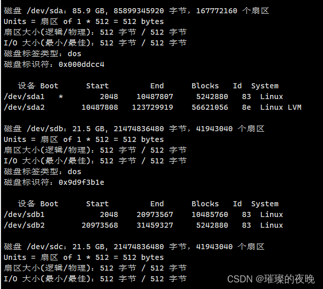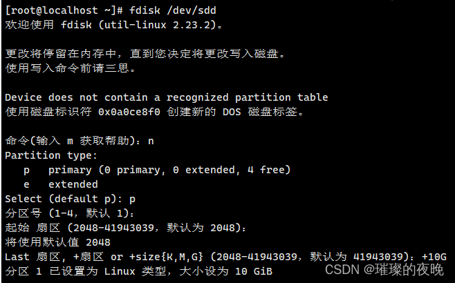 fdisk 支持最大的存储卷 2.2TB ,最多分4个主分区或3个主分区、1个扩展分区,在扩展分区里再分多个逻辑分区