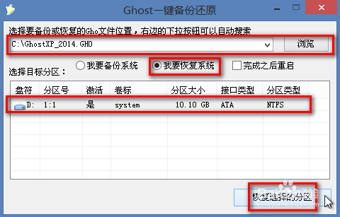 6.gho:运行桌面的Ghost备份还原,选择虚拟光驱里的gho文件,点“我要恢复系统”,选择要安装的系统盘,点“恢复选择的分区”。如下图所示