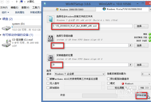 esd(wim):运行桌面的Windows安装器(WinNTSetup),选择虚拟光驱里的esd(wim)文件,引导驱动器和安装磁盘的位置都选择“D:”(系统分区),点开始安装,按实际情况决定是否勾上完成后自动重启,再点确定。如下图所示