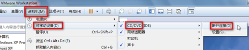 5.硬盘分区完成后,直接点虚拟机菜单上的“虚拟机→可移动设备→CD/DVD→设置”(下方光盘图标→设置),选择装有gho、esd(wim)的iso文件,然后点确定。