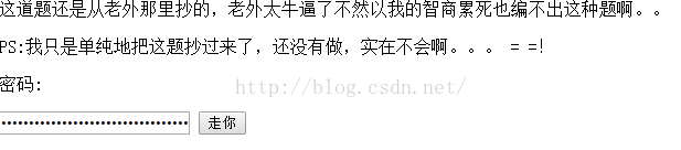<p><input type="password" name="password" class="input" id="password"> <input type="submit" class="button" value="走你"></p>