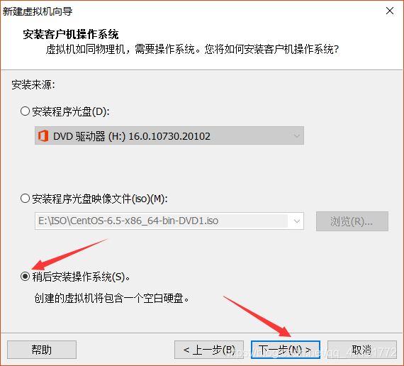 2.首先选择安装光盘映像文件,然后选择“稍后安装操作系统(S)如下图: