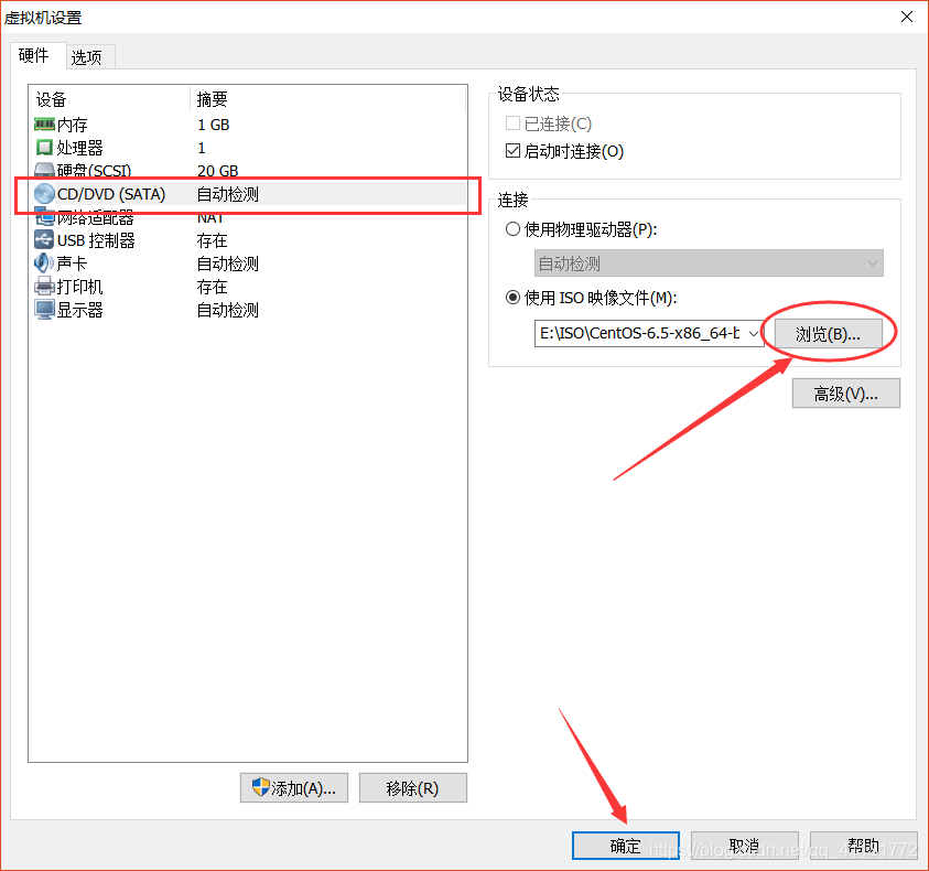 7.接着双击CD/DVD,点击“浏览”,把事先安装好的镜像放进去如下图: