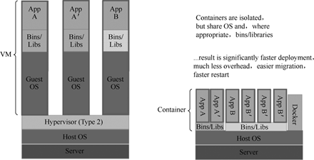 容器计算是软件定义计算虚拟化的新锐势力,它与虚拟机技术的最大区别在于不需要虚拟化整个服务器的硬件栈(Server Hardware Stack),而是在操作系统层面对用户空间进行抽象化,因此我们也称其为OS-level Virtualization(操作系统级虚拟化),以区别于之前的基于硬件虚拟化的虚拟机技术。基于容器技术的每个用户应用不需要单独加载操作系统内核(见下图),在同样的硬件之上,可以支撑数以百计的容器,但是只能支撑数以十计的虚拟机。