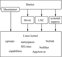 在表中,Linux LXD是基于LXC构造的,准确地说是提供了一套优化的容器管理工具集(以及Linux distro分发模板系统);ThinApp是VMware公司的应用虚拟化(Application Virtualization)解决方案,面向Windows操作系统应用;rkt(appc)则是CoreOS公司联合业界推出的与Docker既兼容又对抗的容器虚拟化架构;Docker在早期阶段也是基于LXC之上,不过随后推出了自己的libcontainer库,图3-28能很好地说明Docker的基本架构。