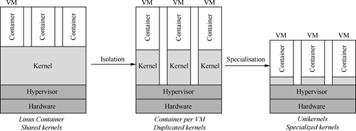 如上图所示,很显然,Unikernels缩减了操作系统内核的足印(Footprint),也简化了每个容器化应用对底层的依赖关系,由此带来更快的部署、迁移运行速度—这也解释了为什么Docker在2016年年初收购了初创公司Unikernels Systems(开源库操作系统MirageOS的开发者)。