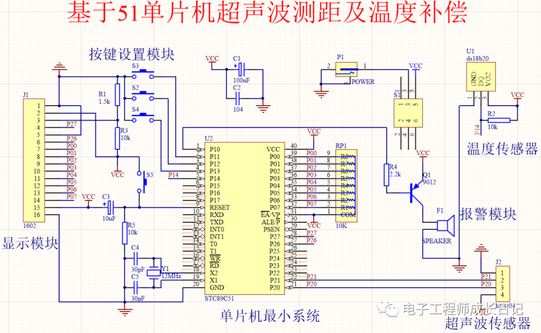 系统由STC89C52单片机+超声波测距传感器(HC-SR04)+DS18B20温度传感器+LCD1602液晶显示屏+按键+蜂鸣器+电源构成