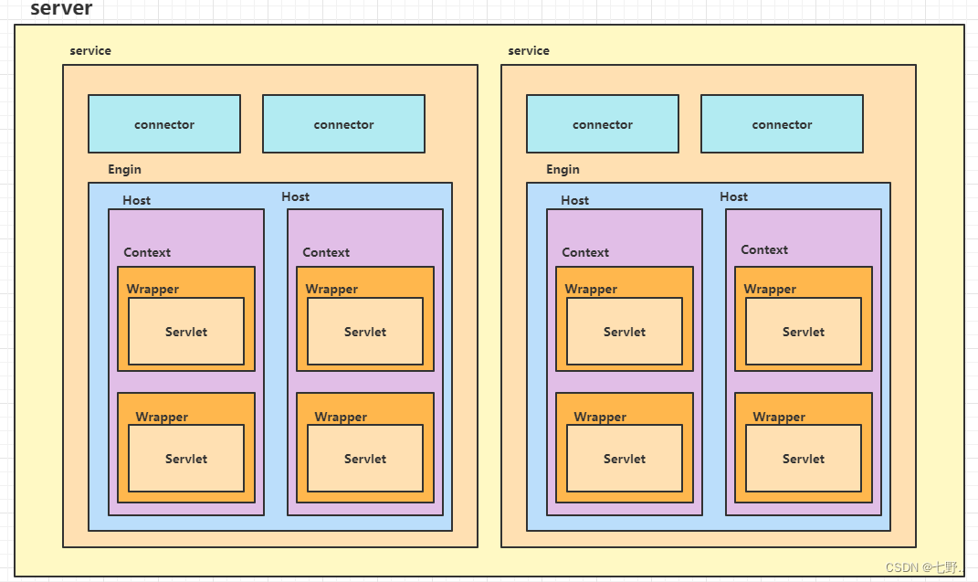 代表整个Catalina Server容器,是tomcat实例的顶层元素,由org.apach.catalina.Server接口定义,其下可以包含一个或多个Service元素