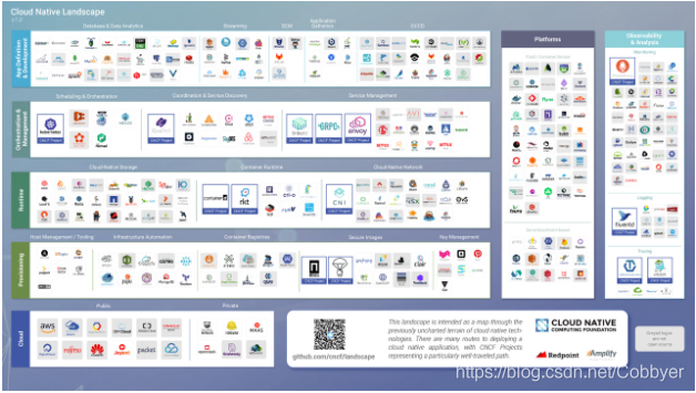 在讲云原生之前,我们先了解一下CNCF,即云原生计算基金会,2015年由谷歌牵头成立,基金会成员目前已有一百多企业与机构,包括亚马逊、微软。思科等巨头。目前CNCF所托管的应用已达14个,下图为其公布的Cloud Native Landscape,给出了云原生生态的参考体系。