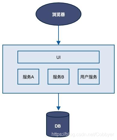 传统的Web开发方式,一般被称为单体架构(Monolithic)所有的功能打包在一个WAR包里,基本没有外部依赖(除了容器),部署在一个JEE容器(Tomcat,JBoss,WebLogic)里,包含了DO/DAO,Service,UI等所有逻辑。其架构如下图所示。