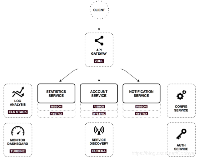 从上图Spring Cloud组件的架构可以看出在微服务架构中所必须的组件,包括:服务发现与注册、熔断机制、路由、全局锁、中心配置管理、控制总线、决策竞选、分布式会话和集群状态管理等基础组件。
