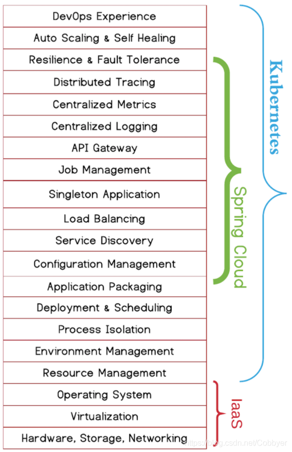 Spring Cloud和Kubernetes有很大的不同,Spring Cloud和Kubernetes处理了不同范围的微服务架构技术点,而且是用了不同的方法。Spring Cloud方法是试图解决在JVM中的微服务架构要点,而Kubernetes方法是试图让问题消失,为开发者在平台层解决。Spring Cloud在JVM中非常强大,Kubernetes管理那些JVM很强大。看起来各取所长,充分利用这两者的优势是自然而然的趋势了。