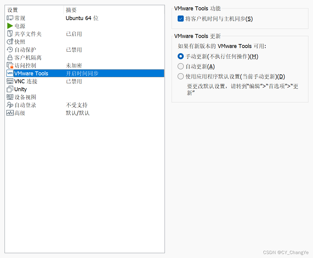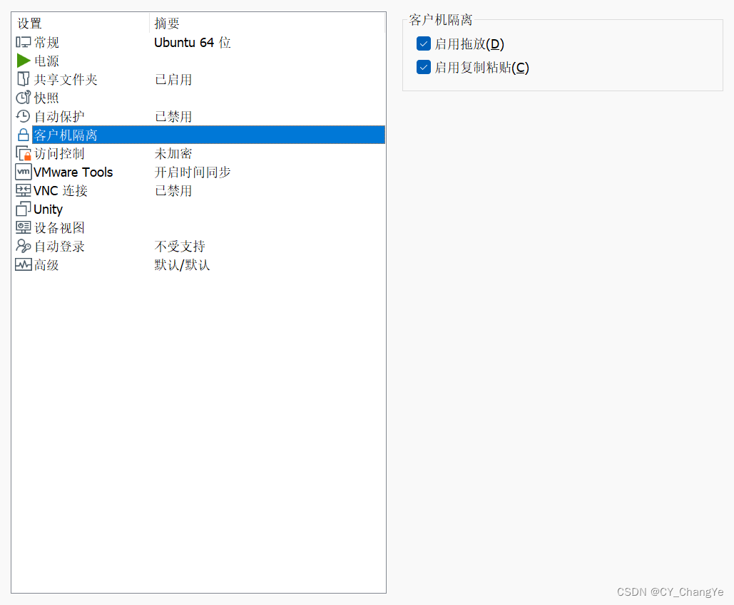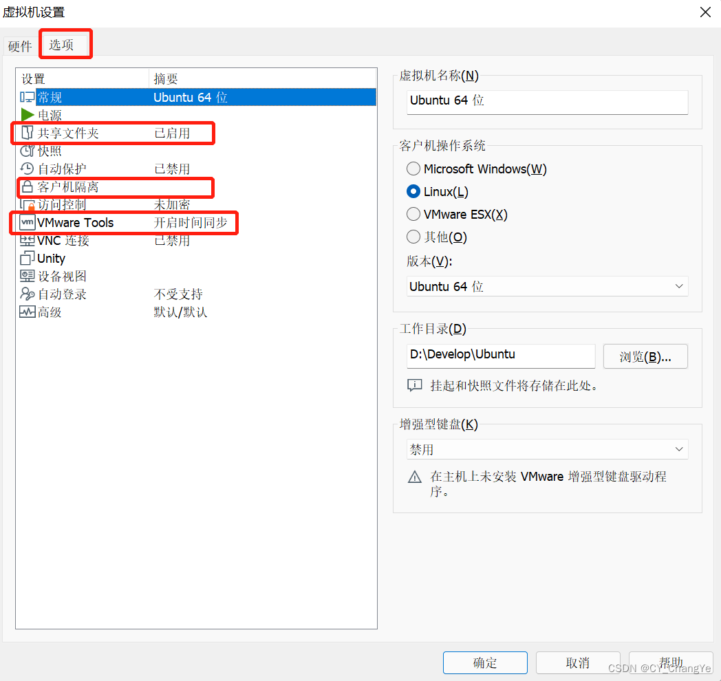 3、在虚拟机设置中打开共享文件夹、勾选客户机隔离、打开VMware Tools的时间同步。