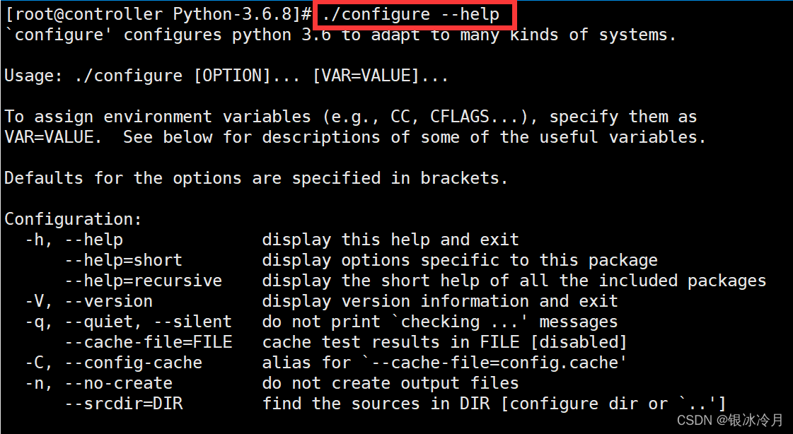 Linux下源码的安装一般由3个步骤组成:配置(configure)、编译(make)、安装(make install),具体的安装方法一般都会给出文档,这里主要讨论配置(configure)。Configure是一个可执行脚本,它有很多选项,在源码路径下使用命令./configure –help输出详细的选项列表,如下: