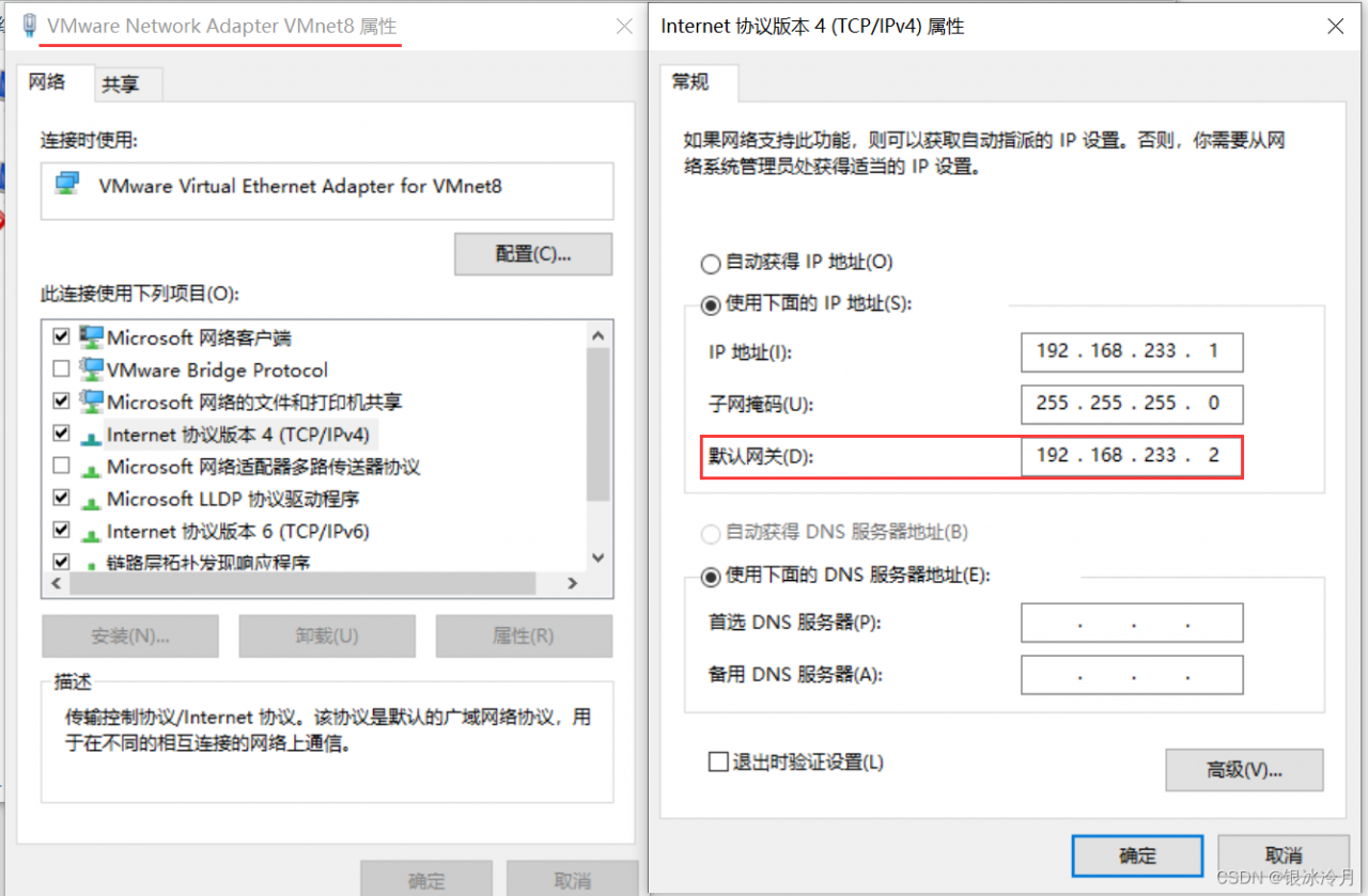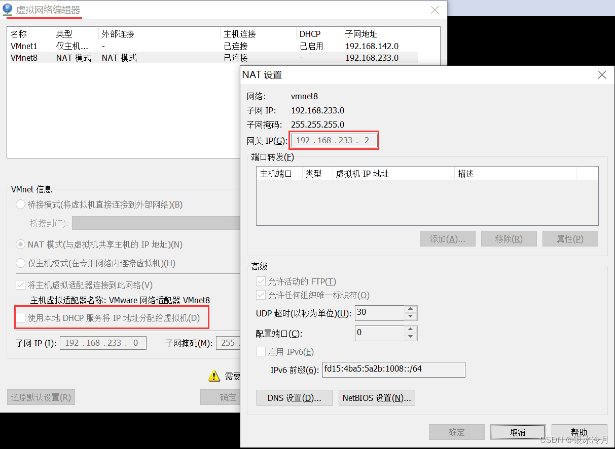 设置虚拟NAT网卡的网关地址和本机虚拟网卡的网关地址一样,设置虚拟机的网络配置