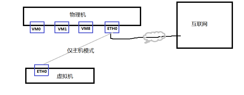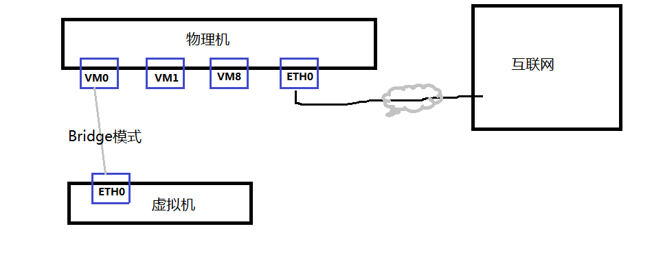 虚拟机和物理机同等地位,相当于你同事和你的电脑,物理机上虚拟网卡VM0相当于交换机(集线器),一头连到了家用路由器,另外N头接所有需要上网的电脑。所以虚拟机的网络配置和物理机保持一模一样。