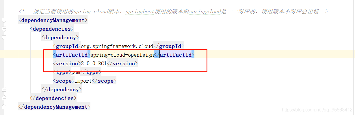 重点:Spring Cloud对Feign的支持由org.springframework.cloud:spring-cloud-netflix-core移到org.springframework.cloud:spring-cloud-openfeign-core下,而Finchley.M9版本下的spring-cloud-starter-openfeign:2.0.0.M2的pom依赖文件中导入的是spring-cloud-netflix-core而非spring-cloud-openfeign-core,需要我们在pom文件中添加对应依赖管理使spring-cloud-starter-openfeign版本更新到2.0.0.RC1。