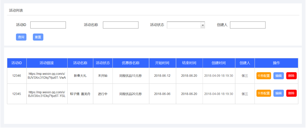 活动创建后到活动列表页,同时生成一个活动链接,接下来就是为这个活动关联之前生成的优惠券。