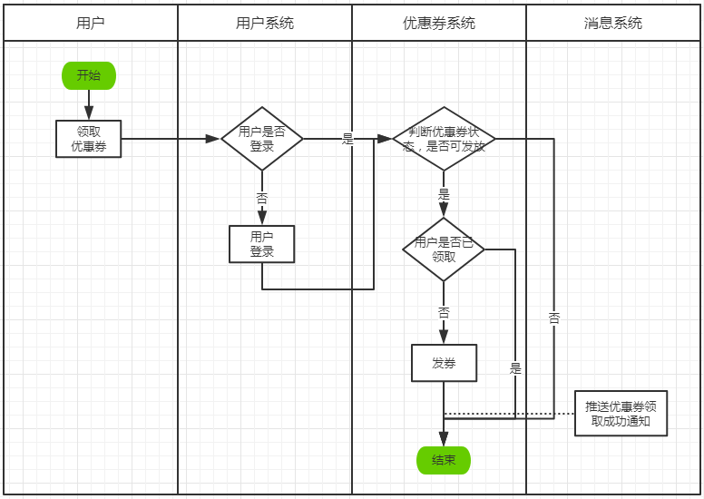 领取通常伴随着消息通知,如:短信、微信公众号,因此通知系统和营销系统也要打通。