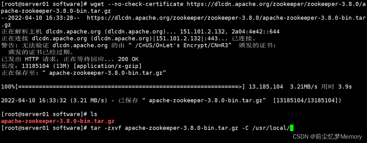 [root@server01 software]# tar -zxvf apache-zookeeper-3.8.0.tar.gz -C /usr/local/