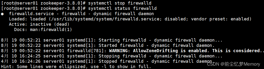 [root@server01 zookeeper-3.8.0]# systemctl stop firewalld
