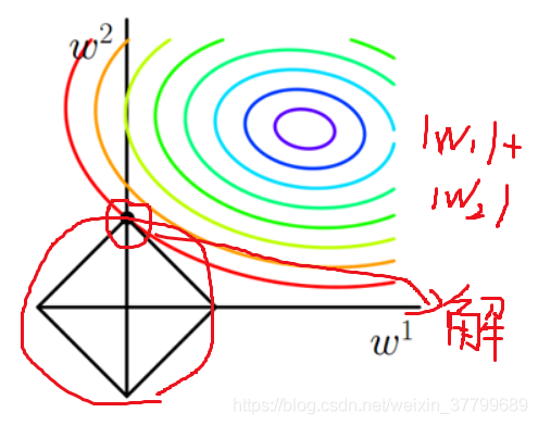 注意到L1正则化是权值的绝对值之和,J是带有绝对值符号的函数,因此J是不完全可微的。机器学习的任务就是要通过一些方法(比如梯度下降)求出损失函数的最小值。当我们在原始损失函数J0后添加L1正则化项时,相当于对J0做了一个约束。考虑二维的情况,即只有两个权值w1和w2,此时L=|w1|+|w2|对于梯度下降法,求解J0的过程可以画出等值线,同时L1正则化的函数L也可以在w1、w2的二维平面上画出来。如下图: