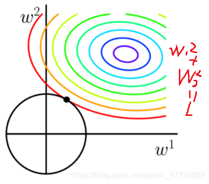 二维平面下L2正则化的函数图形是个圆,与方形相比,被磨去了棱角。因此J0与L相交时使得w1或w2等于零的机率小了许多,这就是为什么L2正则化不具有稀疏性的原因。