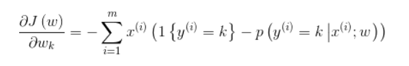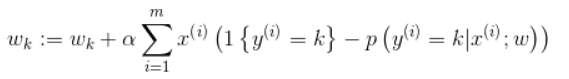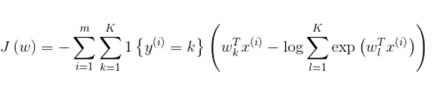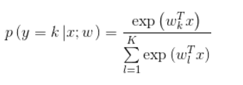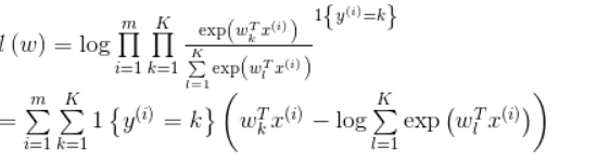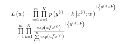 在已知参数w和数据x的情况下,预测值y为类别k的条件概率。同时,在已知现有数据的条件下,w是真正参数的概率,以数据出现的概率最大为前提(见本人博客最大似然估计),构造似然函数: