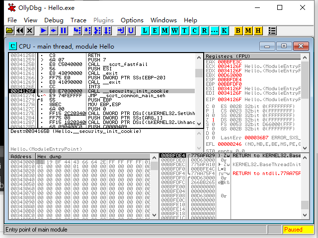 第一次接触OllyDbg,用Code Block 写了一个控制台程序,编译后得到Hello.exe,用官网下载的OllyDbg打开该文件显示如下图。