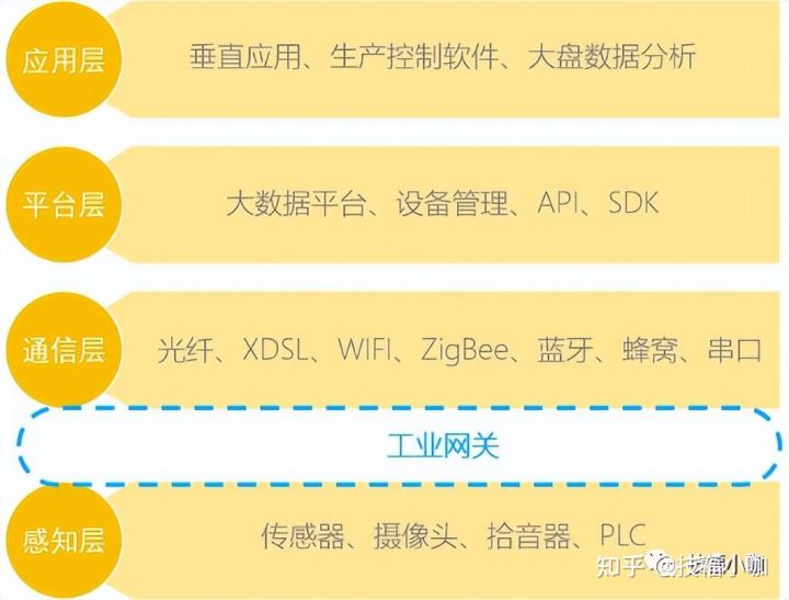 通信层 主要由各种网络设备和线路组成,包括具备网络固线的光纤、xDSL,也包括通过无线电波通信的GPRS、3G、4G、5G、WiFi、超声波、ZigBee、蓝牙等通信方式,主要满足不同场景的通信需求。