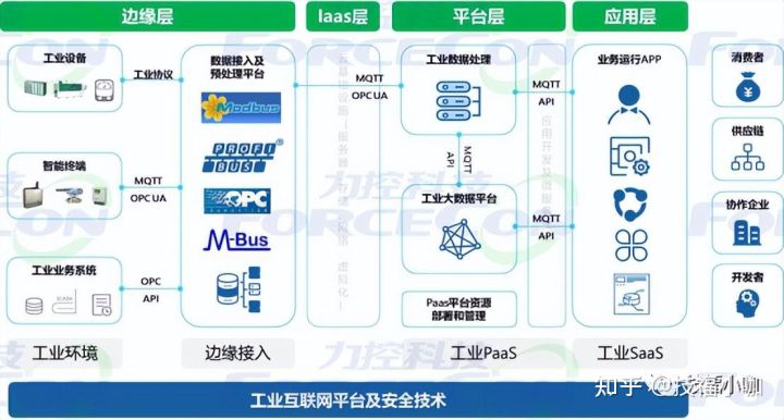 因此,工业互联网平台体系架构必须能完全实现这四个功能,即涵盖边缘层、IaaS层、工业PaaS层、工业SaaS层以及贯穿上述各层级的安全防护。