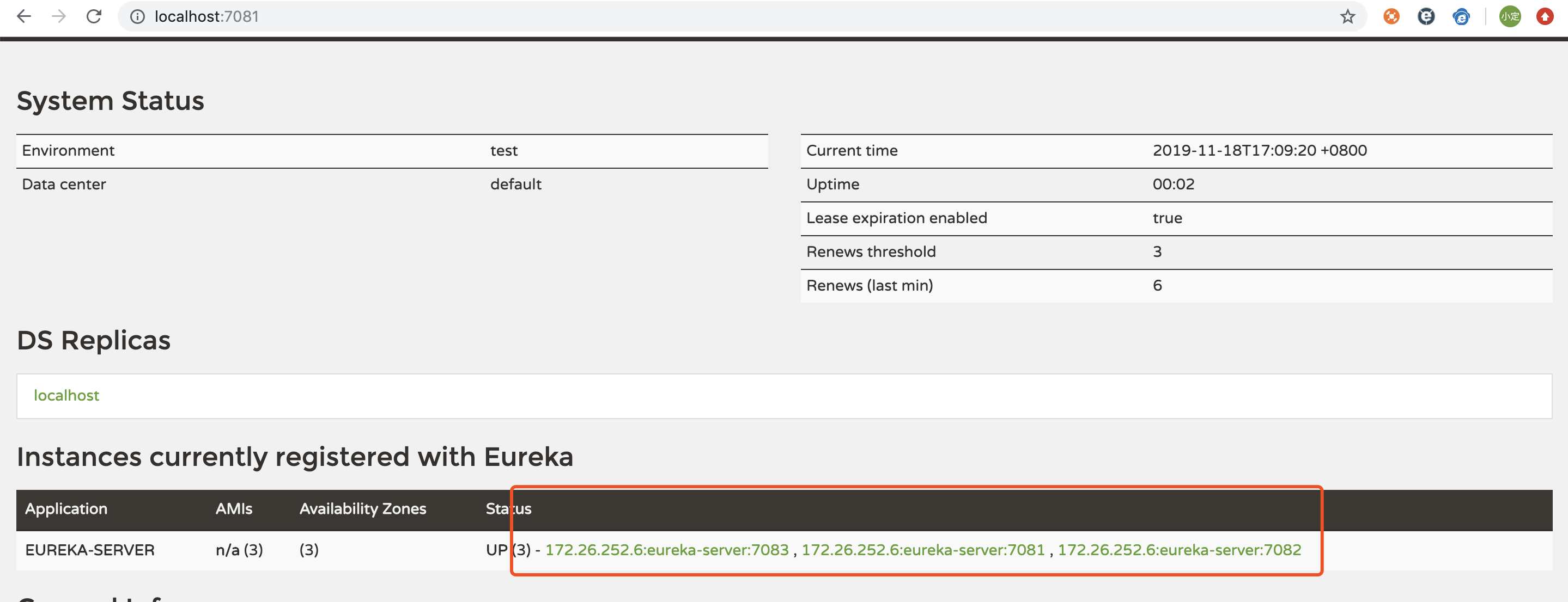 2.5、依次启动eureka-server1、eureka-server2、eureka-server3,访问 http://localhost:7081/ ,如下图,三个rureka已经互相注册了