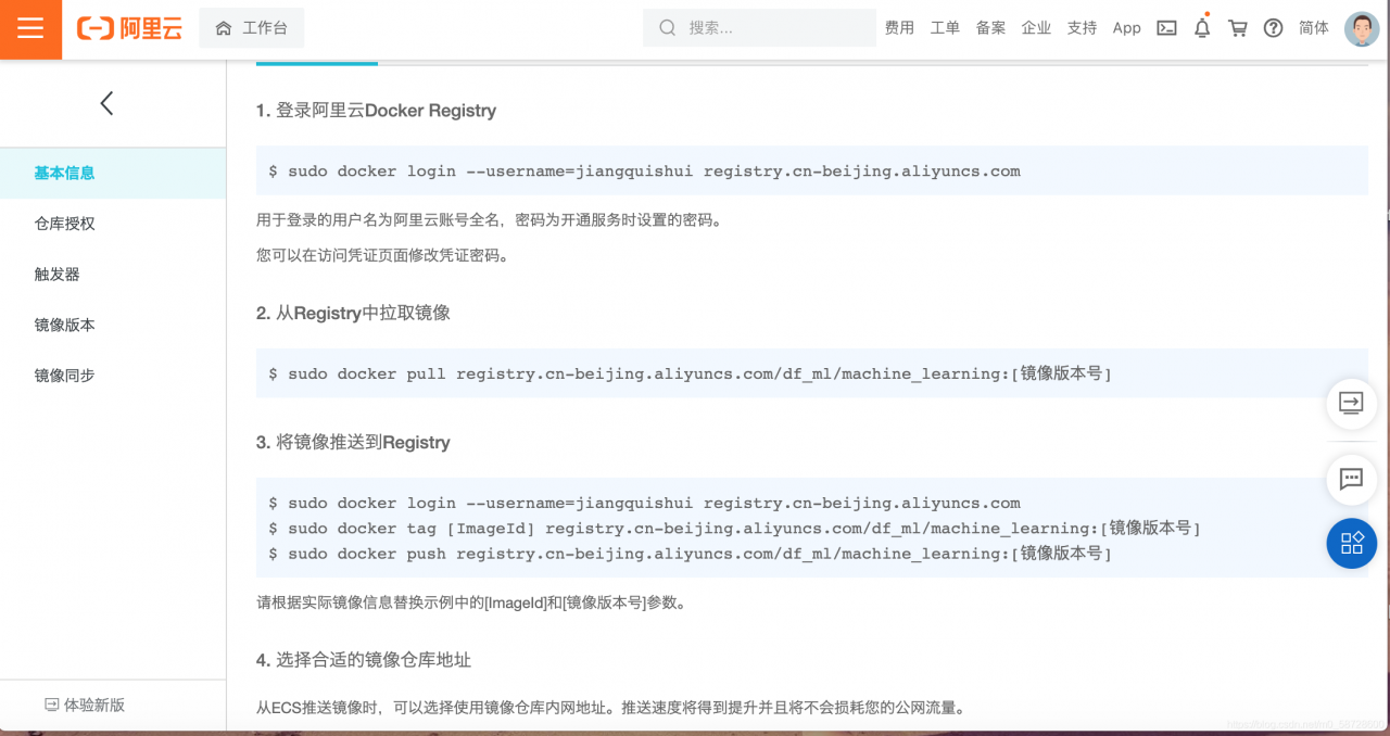 2.点击仓库名称,阿里云会自动生成操作指南